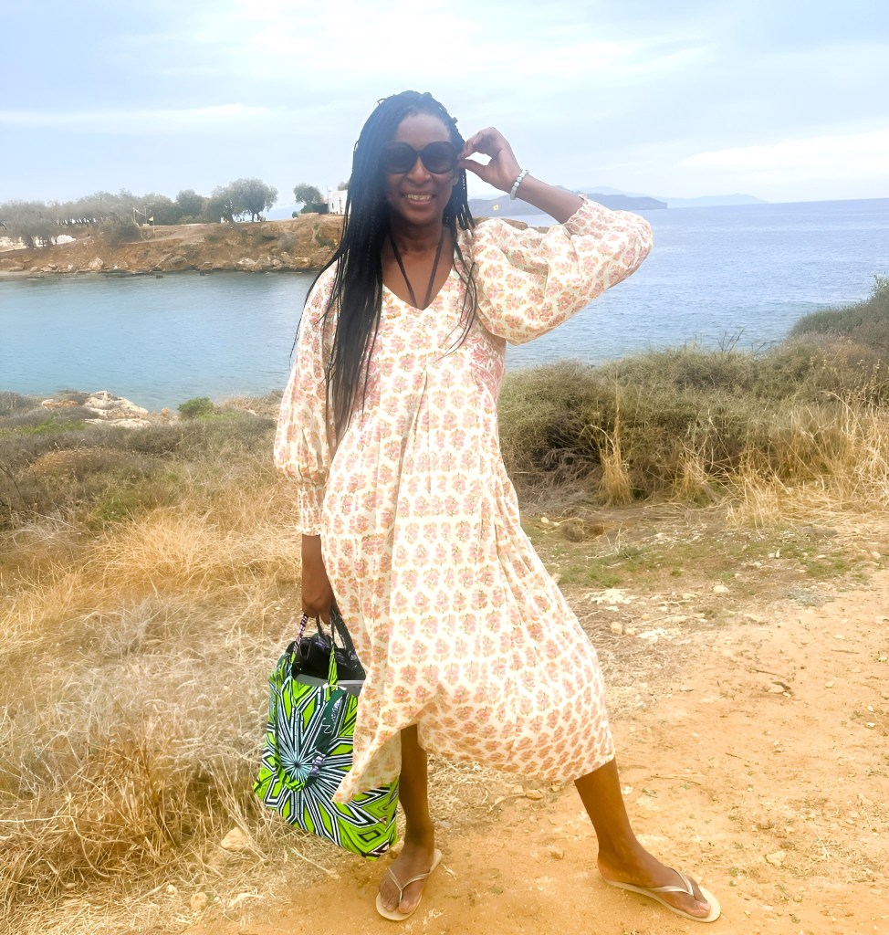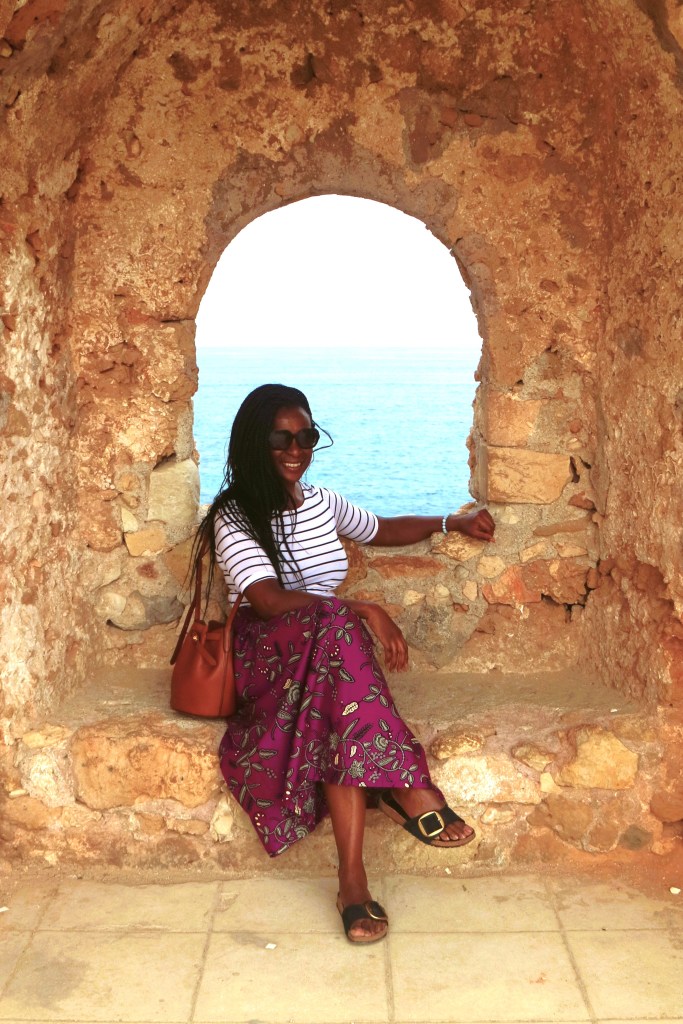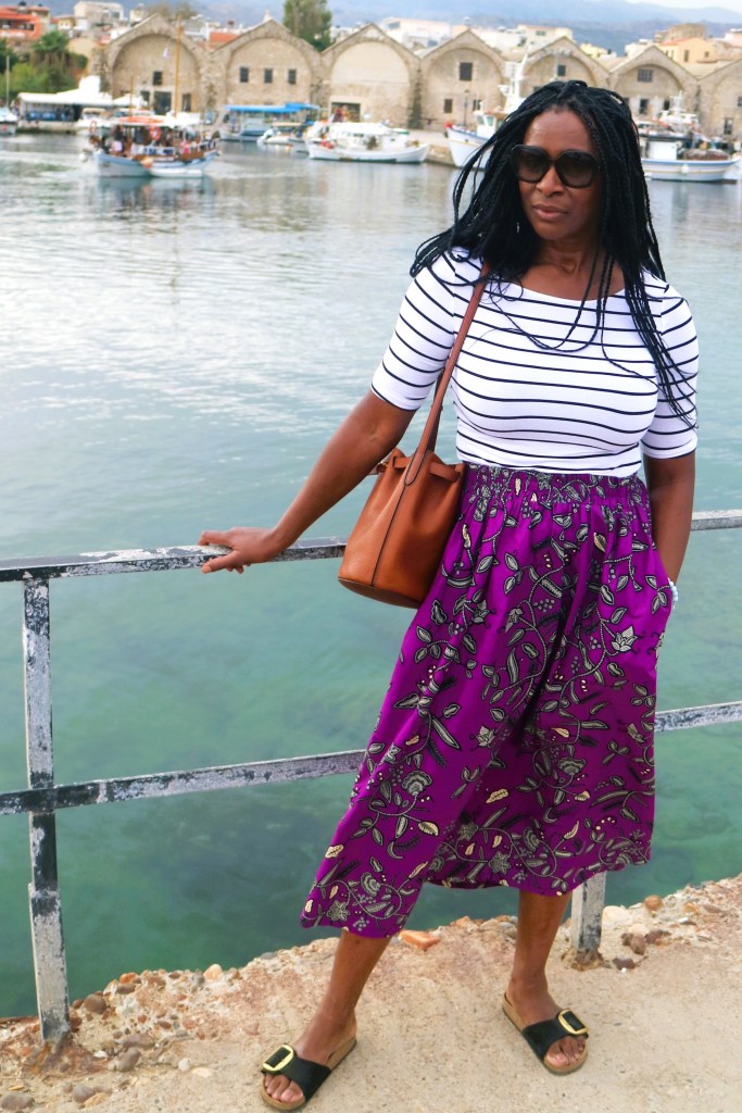 Chania’s old town is like stepping into a postcard — colorful buildings, narrow lanes, and flowers spilling over balconies. I threw on a black and white striped top and the Lola Midi skirt, love mixing prints, and accessorized with a neutral coloured bucket bag and comfortable slides for walking around town. We spent hours exploring tiny shops and hidden cafés.